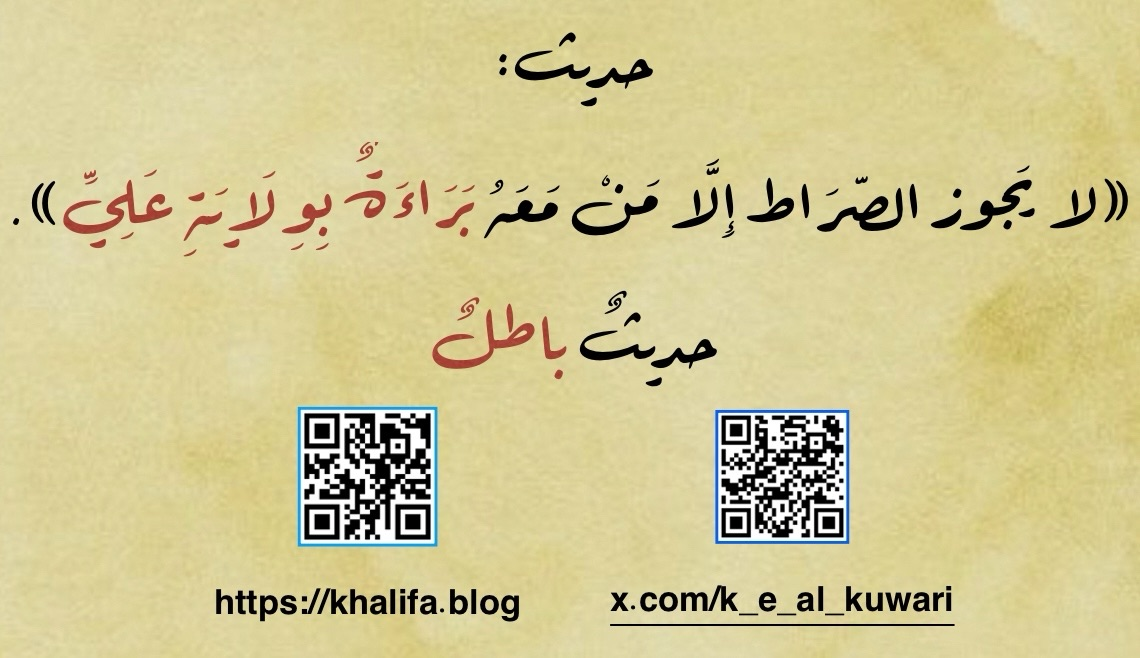 حديث: «إِذَا جَمَعَ اللهُ الْأَوَّلِينَ وَالْآخِرِينَ يَوْمَ الْقِيَامَةِ، وَنَصَبَ الصِّرَاطَ عَلَى جِسْرِ جَهَنَّمَ؛ لَمْ يَجُزْ أَحَدٌ إِلَّا مَنْ كَانَتْ مَعَهُ بَرَاءَةٌ بِوِلَايَةِ عَلِيِّ بْنِ أَبِي طَالِبٍ عَلَيْهِ السَّلَامُ». أخرجه ابنُ الجوزيّ في «الموضوعات»([1])، من طريق أبي عبد الله الحاكم في «تاريخ نيسابور»، قال: حدَّثني عطيّة بن سعيد بن عبد الله الأندلسيّ، قال: حدَّثنا القاسم بن علقمة الأبهريّ، حدَّثني..